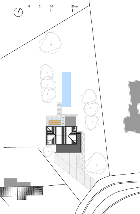 De woning is gelegen in een scherpe bocht van een zijstraat aan de drukke verbindingsweg tussen Leuven en Tienen. Juist daar waar nogal wat auto's versnellen of sterk afremmen. Door de voorgevel van deze woning in het verlengde te leggen van de gevels aan de rechterkant van de woning, vindt ze enerzijds toenadering tot de bestaande vrijstaande woningen en sluit ze anderzijds de huizenrij af. Tegelijkertijd zorgt deze inplanting ervoor dat de woning wat afstand neemt van het voorbij razende verkeer. De volumetrie van de woning is eenvoudig en strak. Mede door de woning voor- en achteraan gedeeltelijk te voorzien van een plat dak, blijft het (verplichte!) piramidedak van het hoofdvolume grootendeels uit het oog. Aan de tuinzijde van het gelijkvloers vormen zithoek, eethoek en keuken één open ruimtelijk geheel. Een variatie in plafondhoogte geeft elke zone zijn eigen identiteit. De functionele ruimtes (o.a. garage, bijkeuken, inkom en toilet) van het gelijkvloers liggen aan de straatkant.